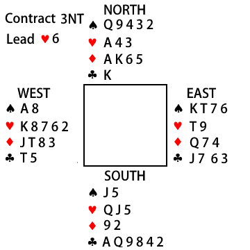 South is the declarer in 3NT. West leads the ♥6.