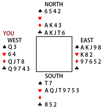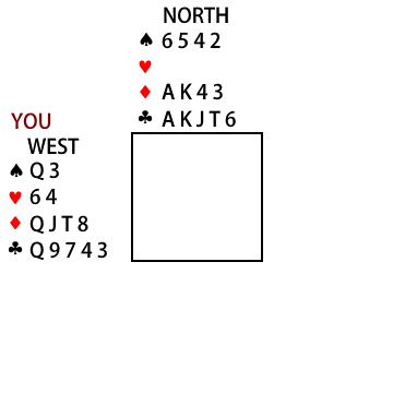 Your partner signaled with his lowest spade. This attitude signal said that he was discouraging a spade continuation. Partner could have won the opening lead by overtaking your queen, but he preferred to leave you on lead. Based on #1 and #2, what should you conclude? Your partner must be void in a minor! In that case, it's up to you to find his void. You and dummy have a total of 10 clubs, but only 8 diamonds.
